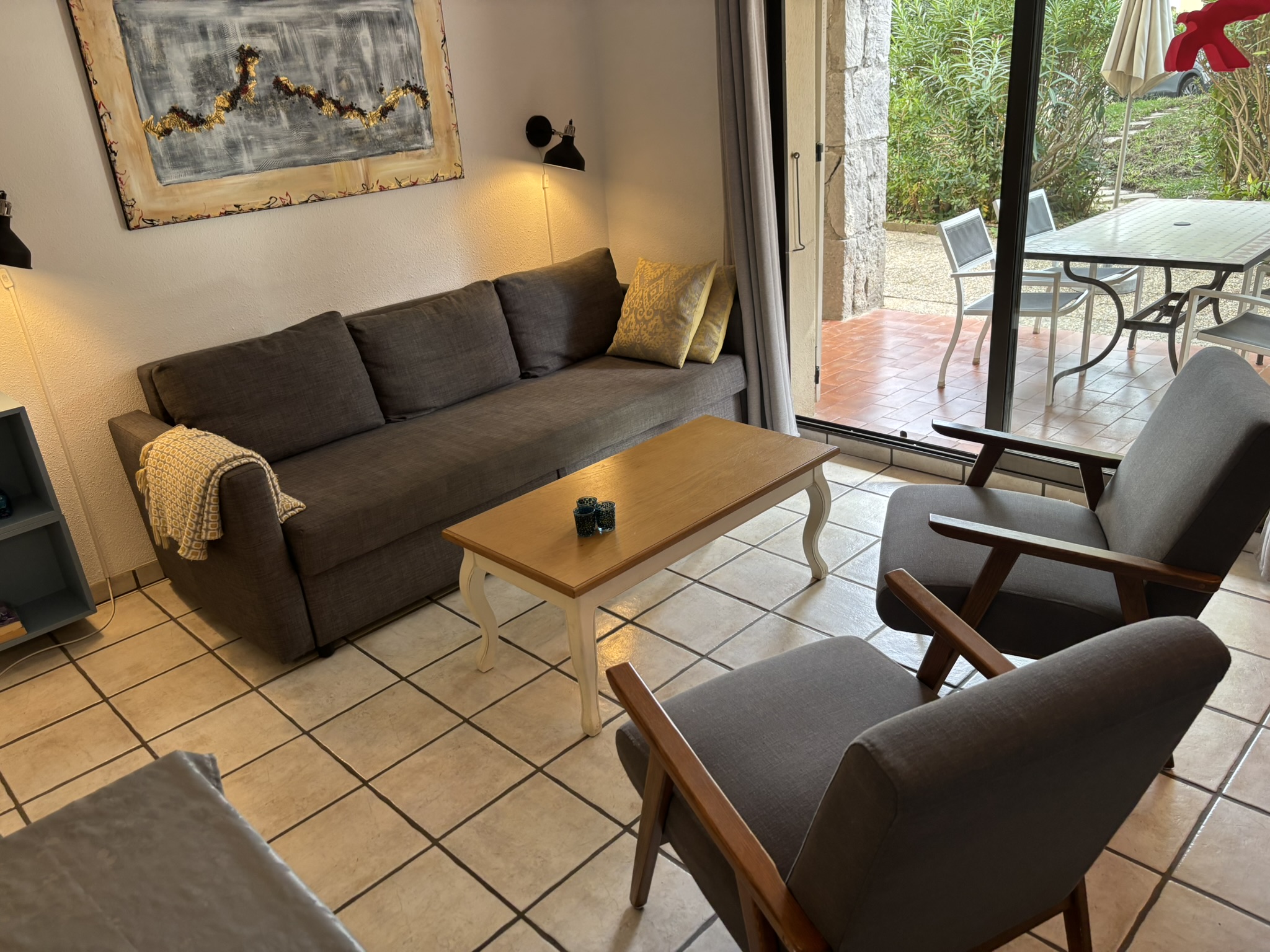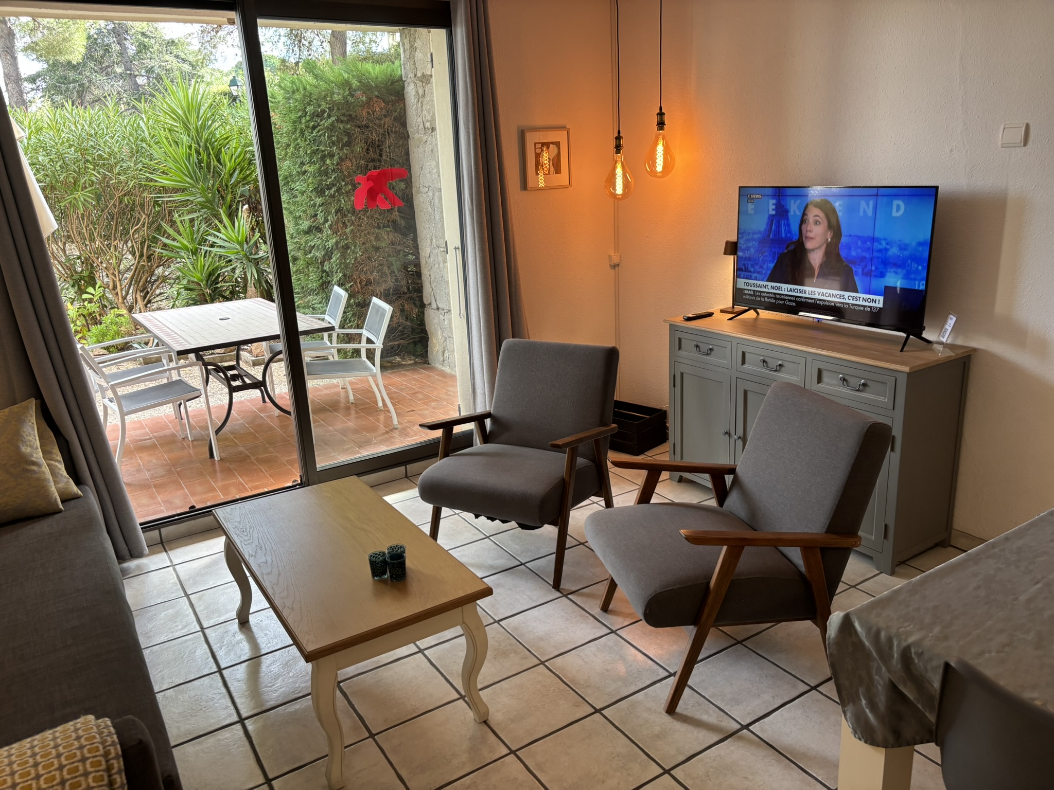 Spise og opholdsafdeling med sofagruppe, der rummer 2 sovepladser. Farve-TV og radio. Udgang til stor have og terrasse.