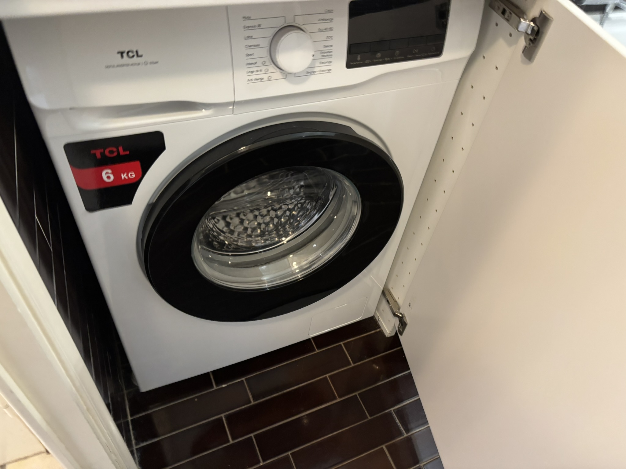Med indbyggede skabe. Strygebrædt og strygejern.